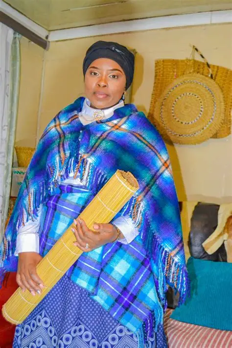 Seana Marena: Elegant women's attire combining a seshoeshoe dress with a Basotho blanket.